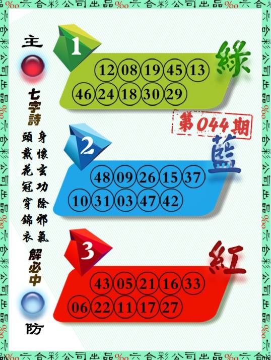044期正版天机诗 细雨飞红上碧桃 。送:蛇狗羊鸡鼠。 推荐:3 0 4头+蓝红波(开?00) |